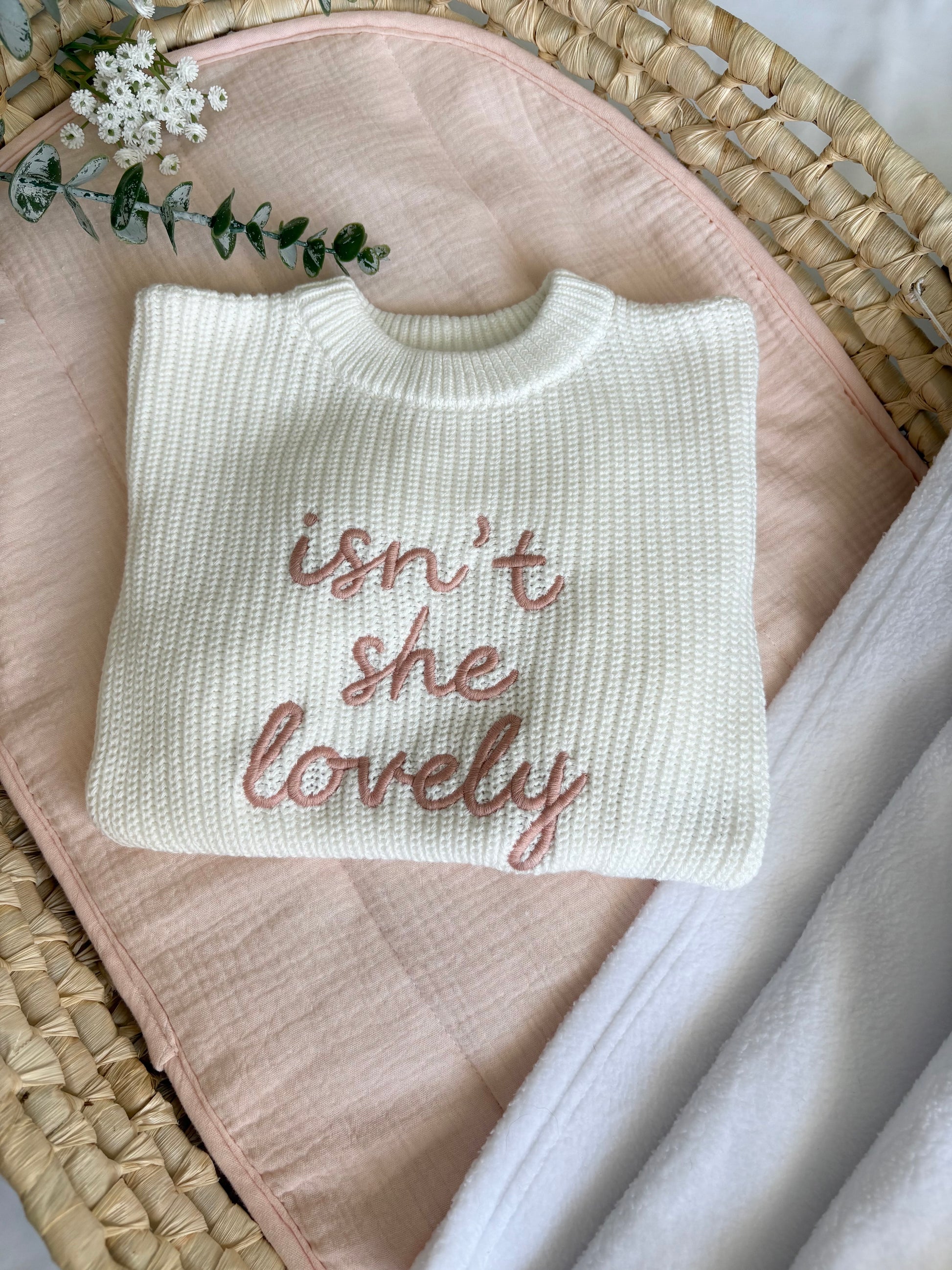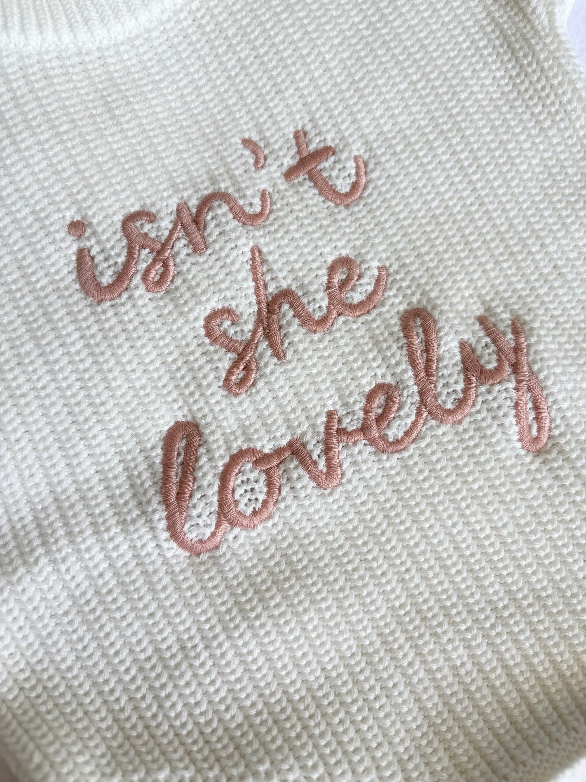 Our white “Isn’t She Lovely” embroidered design brings a touch of elegance to any special moment. Crafted from soft, high-quality fabric, this piece showcases luxurious rose-gold stitching for a classic yet modern look. Perfect for birthdays, baby showers, photoshoots, or everyday sweetness.