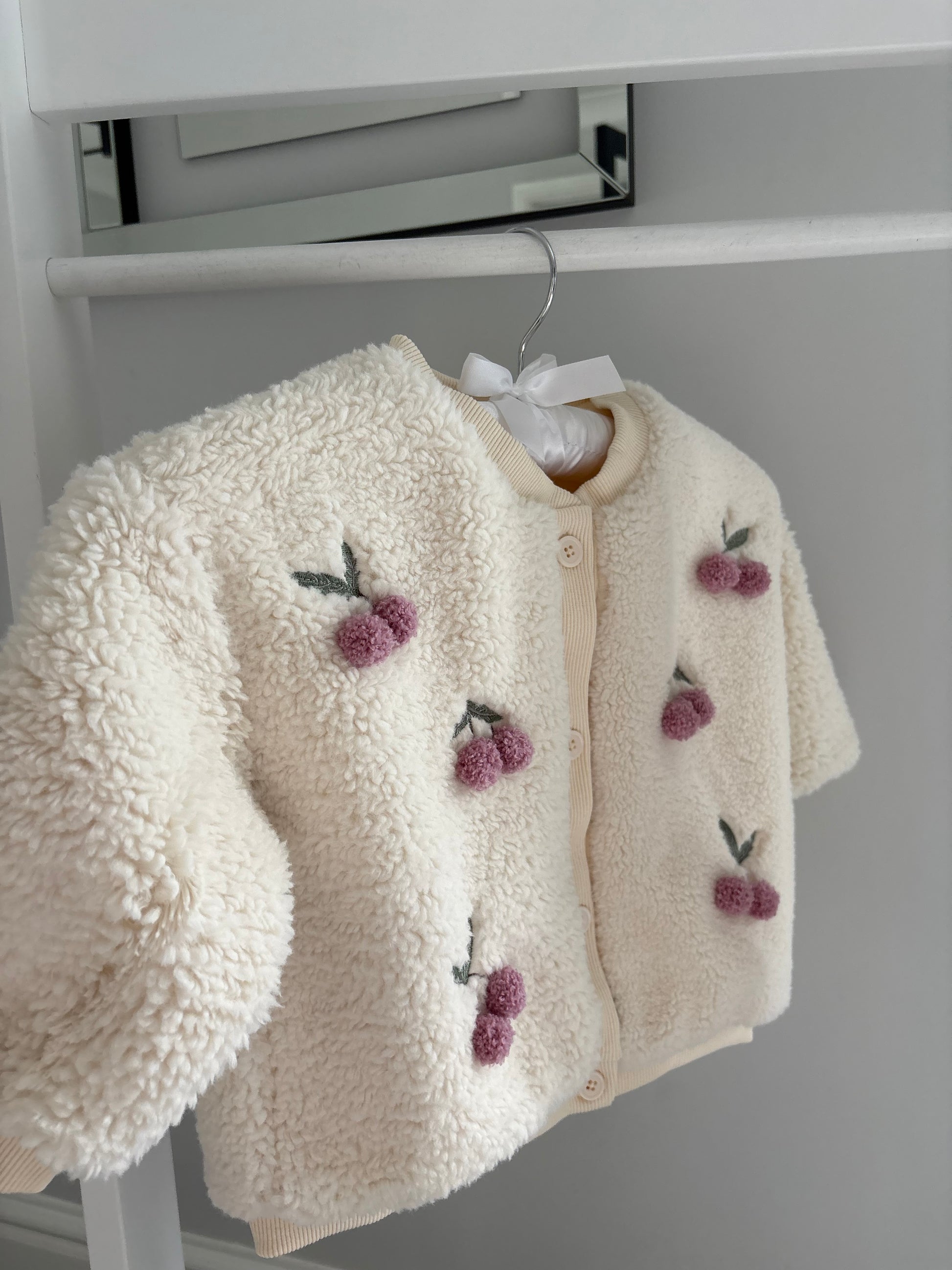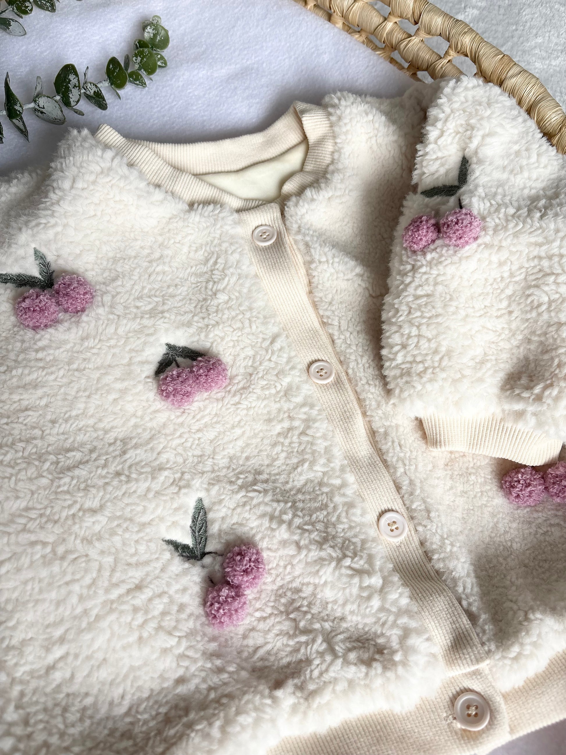 Wrap your little one in softness and style with our adorable baby fleece, featuring delicate embroidery and sweet cherry details. Made from ultra-soft fabric, this cosy piece keeps your baby warm and comfortable all day long. The charming embroidered leaves and fleece type cherries add a playful touch, perfect for everyday wear or special moments.