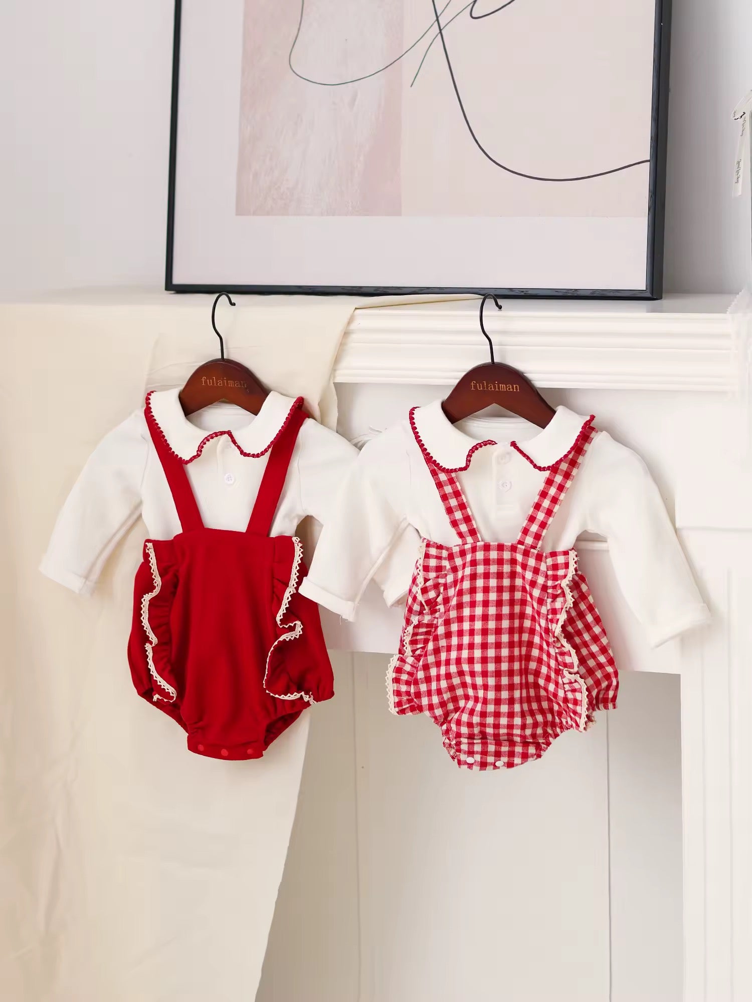 Dress your little one in holiday charm with this adorable two-piece outfit! The set includes a classic white blouse with puff sleeves and delicate detailing, paired with a festive red romper that’s perfect for Christmas celebrations.