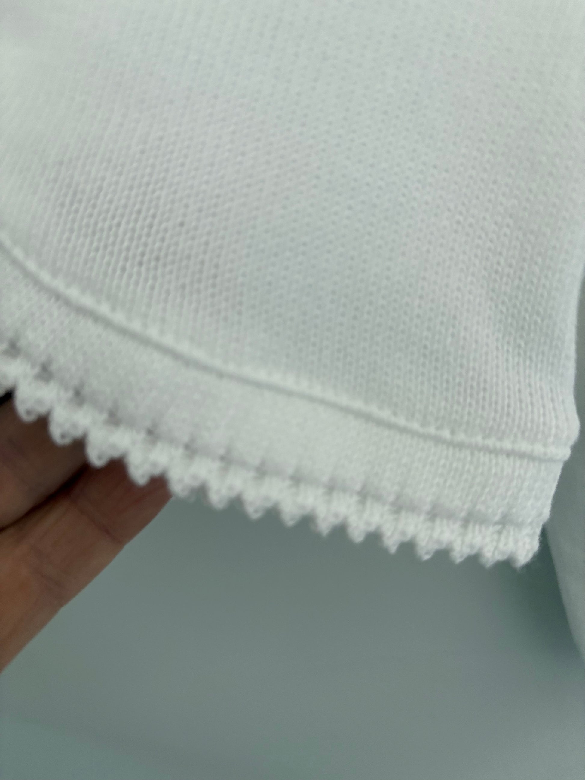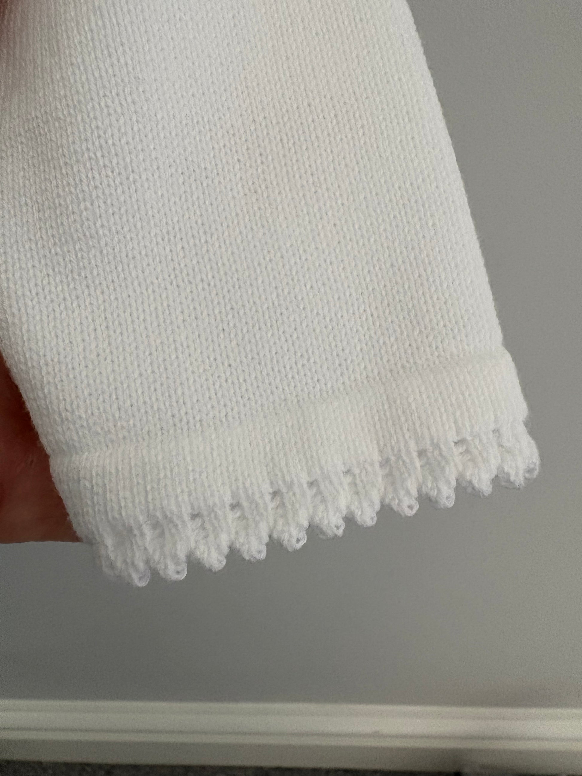 This long sleeved bolero is made from 100% cotton. It has a very pretty semi-frill edging with a pearl button fastening.