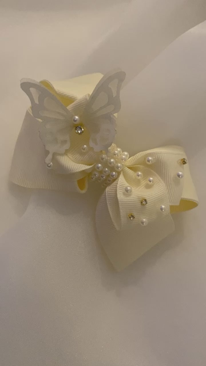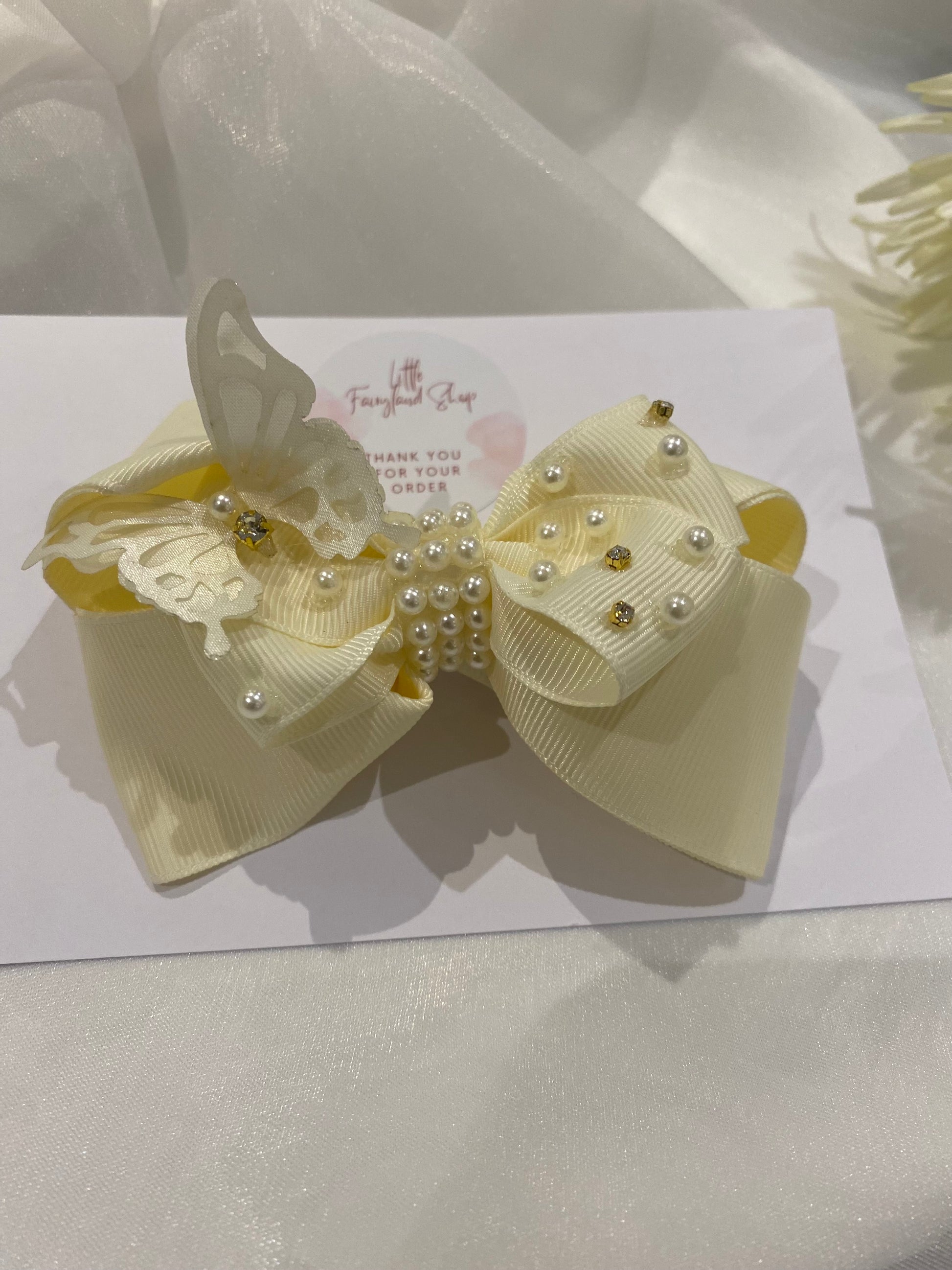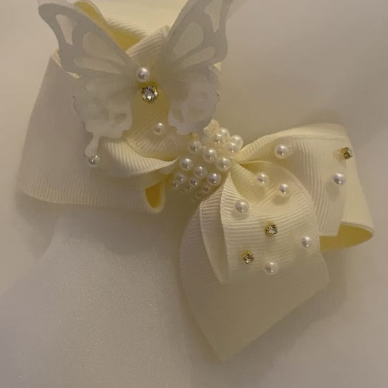 Girls lovely ivory bow hair clip , handmade from grosgrain ribbon, butterfly and pearl embellishments set on a metal clip.