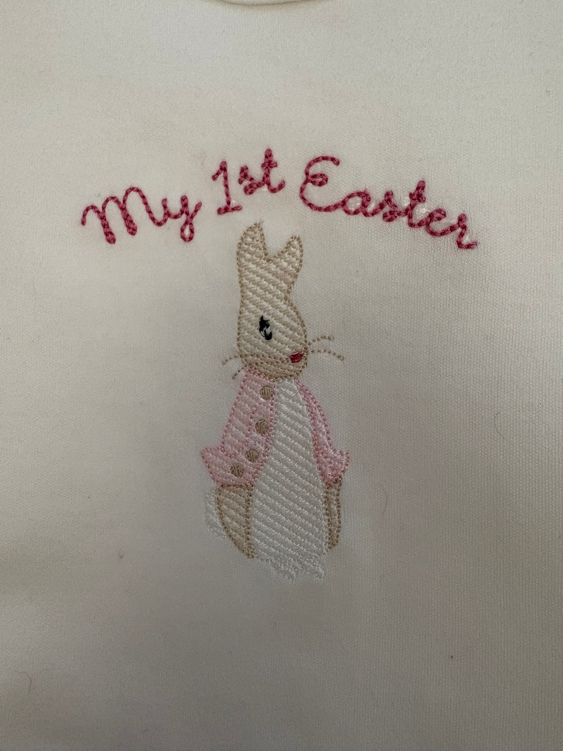 - Above the bunny, it reads “My 1st Easter” in pink stitched lettering