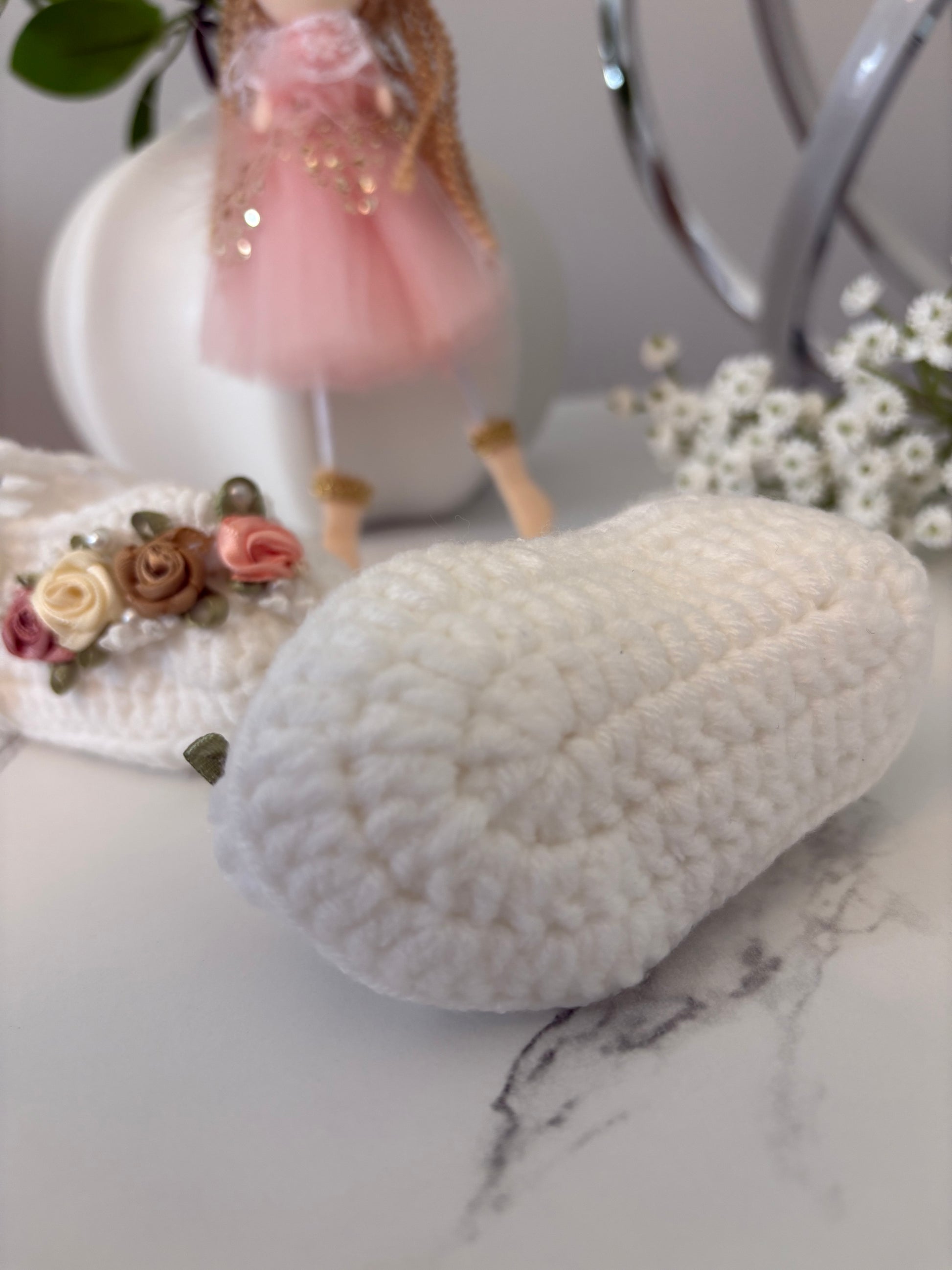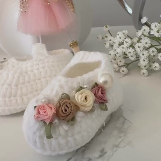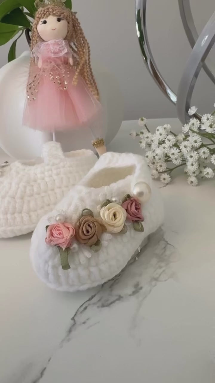 Delicately handcrafted, these baby shoes are made from soft white crochet, offering both comfort and charm for tiny feet. Each pair is adorned with dainty rosebud accents for a sweet, timeless touch. A pearl-style button fastening not only adds elegance but also ensures a secure and easy fit. Perfect for christenings, special occasions, or as a thoughtful gift, these shoes combine traditional craftsmanship with classic style.