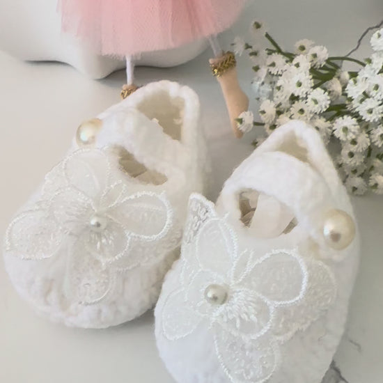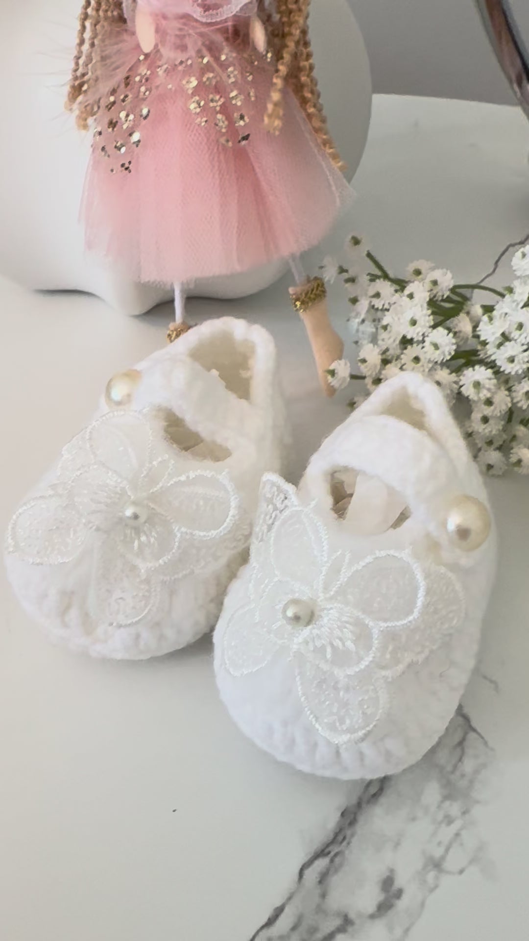 Delicately handcrafted, these charming baby shoes are made from soft white crochet for a gentle and breathable fit. A sweet butterfly appliqué adorns the front, adding a touch of whimsy and elegance. Each shoe is finished with a dainty pearl accent and a secure pearl button fastening, ensuring they stay comfortably in place on tiny feet.